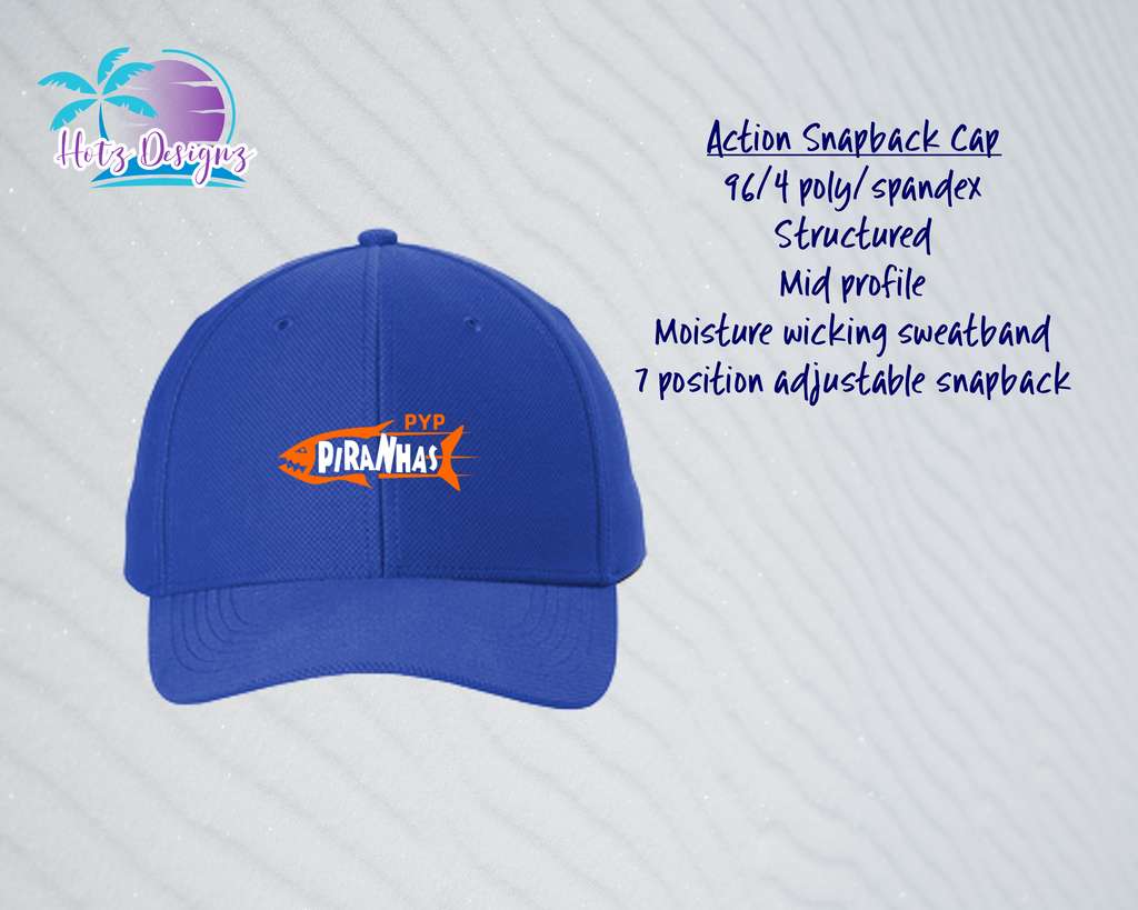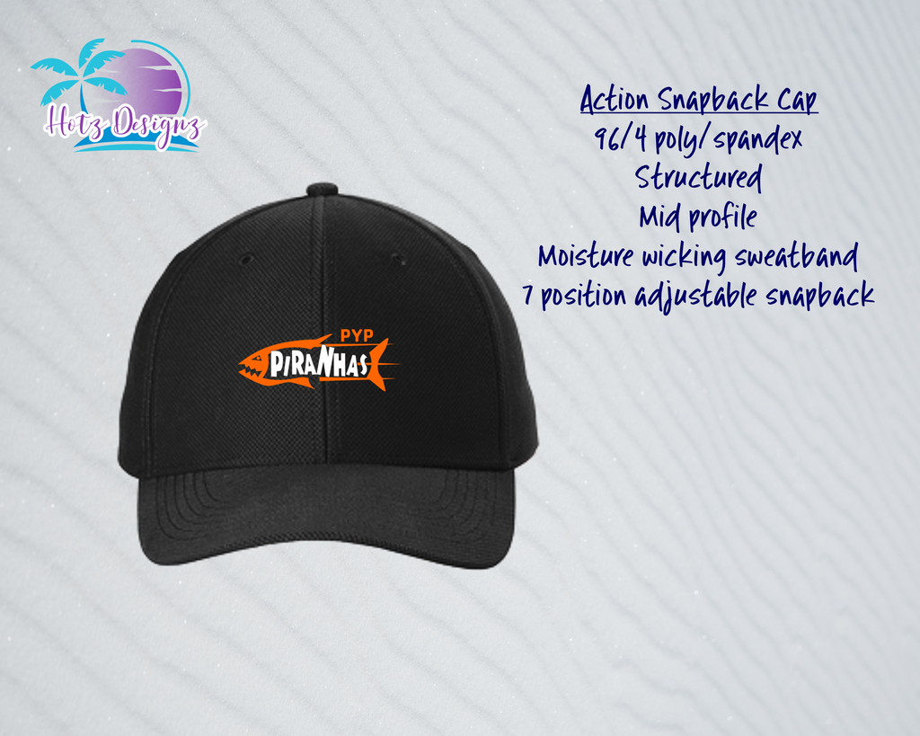 A moisture wicking Sport-Tek action snapback cap with printed Piranhas logo.